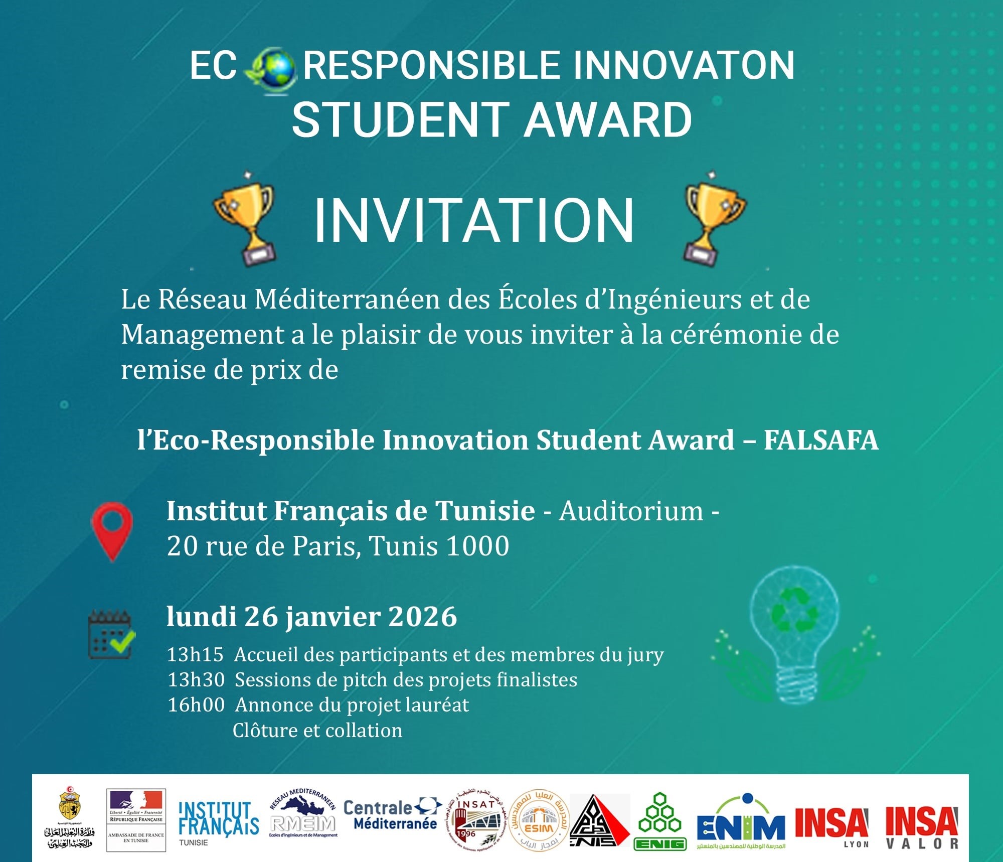 – FALSAFA Le Réseau Méditerranéen des Écoles d’Ingénieurs et de Management (RMEIM) a le plaisir d’annoncer la finale de l’Eco-Responsible Innovation Student Award